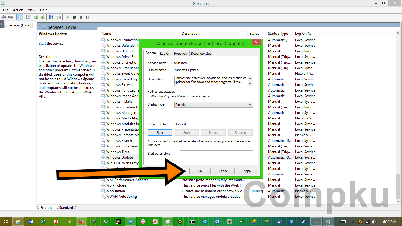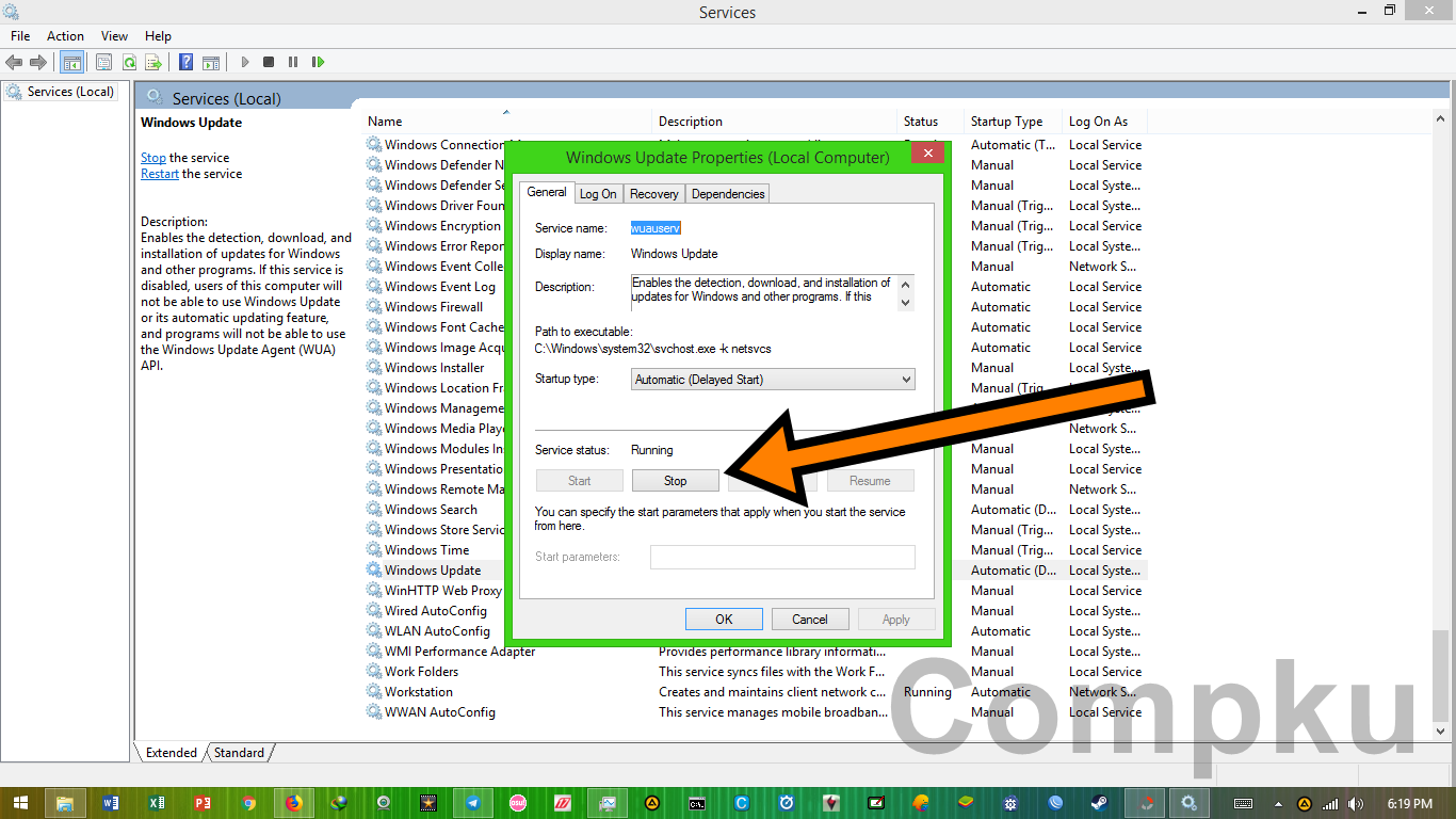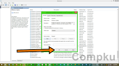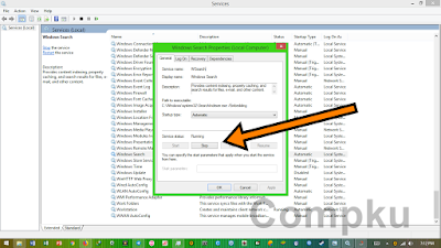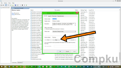 lalu akan tampil box sebagai berikut, pada service status klik Stop :