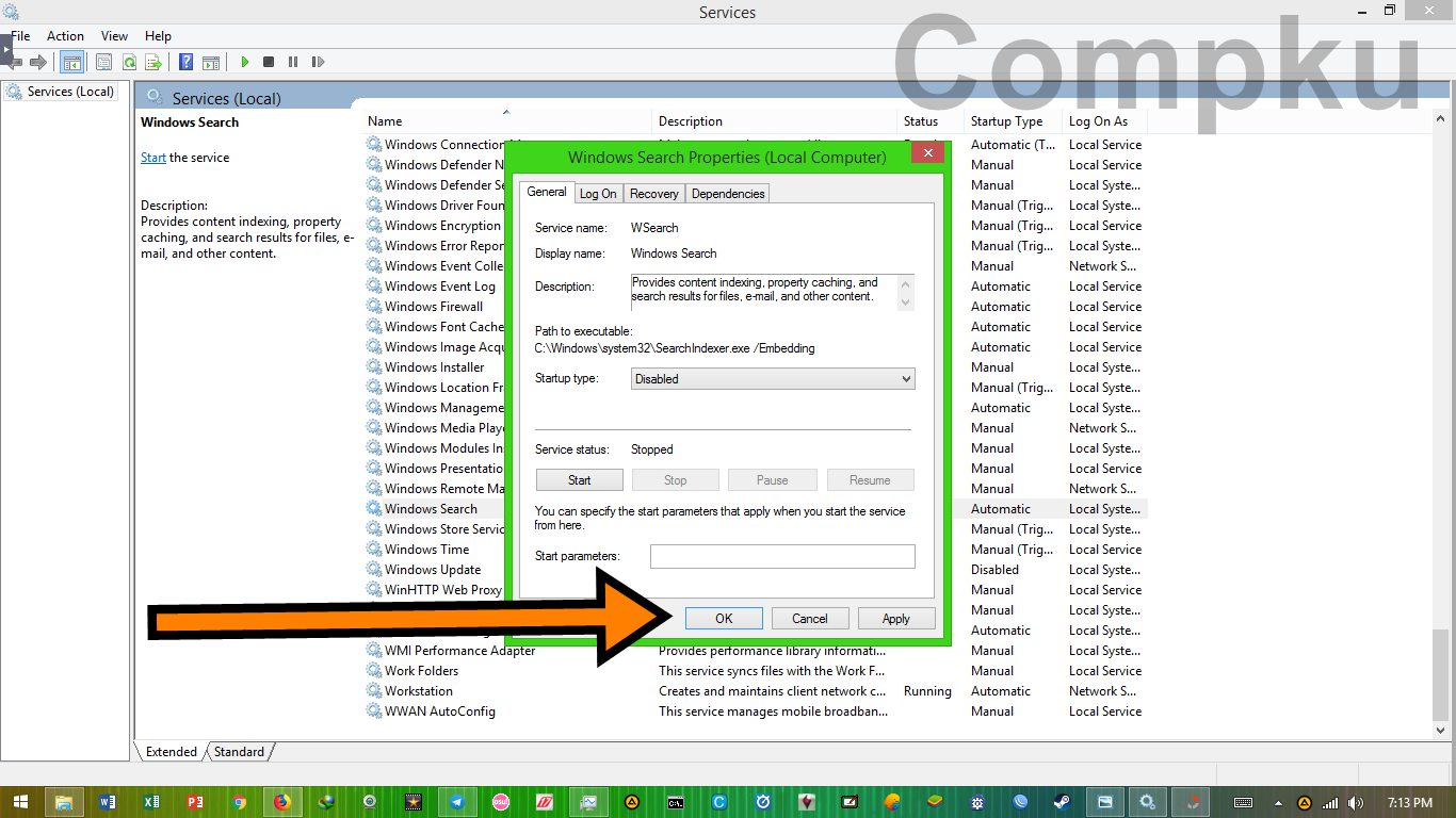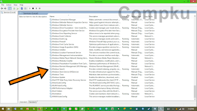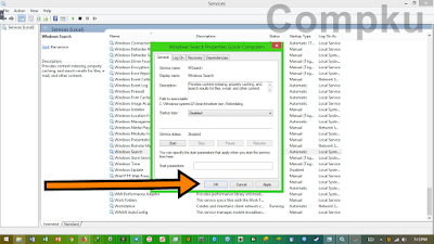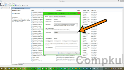 cara kedua yang dapat kita lakukan adalah me-disable service Windows Search. Windows Search berfungsi untuk meng-index kata pencarian data yang kita cari. Service ini cukup penting pada saat kita sedang ingin segera menemukan suatu data yang kita cari, tetapi service ini tidak terlalu sering digunakan jadi untuk meluangkan ruang resource komputer kita perlu me-disable saja dulu. Meskipun service-nya kita disable, fungsi search masih tetap bisa berfungsi tetapi proses perncariannya mungkin akan terasa lambat. Baik, mari kita coba disable service Windows Search dengan langkah sebagai berikut.