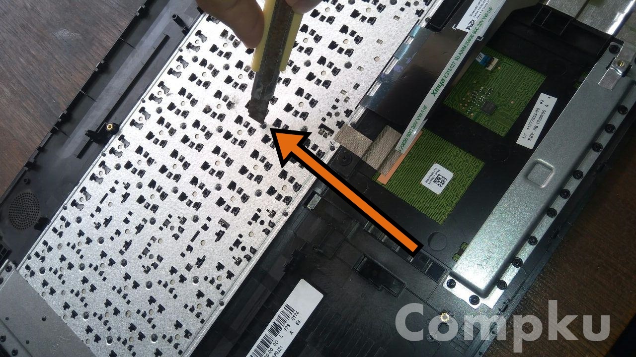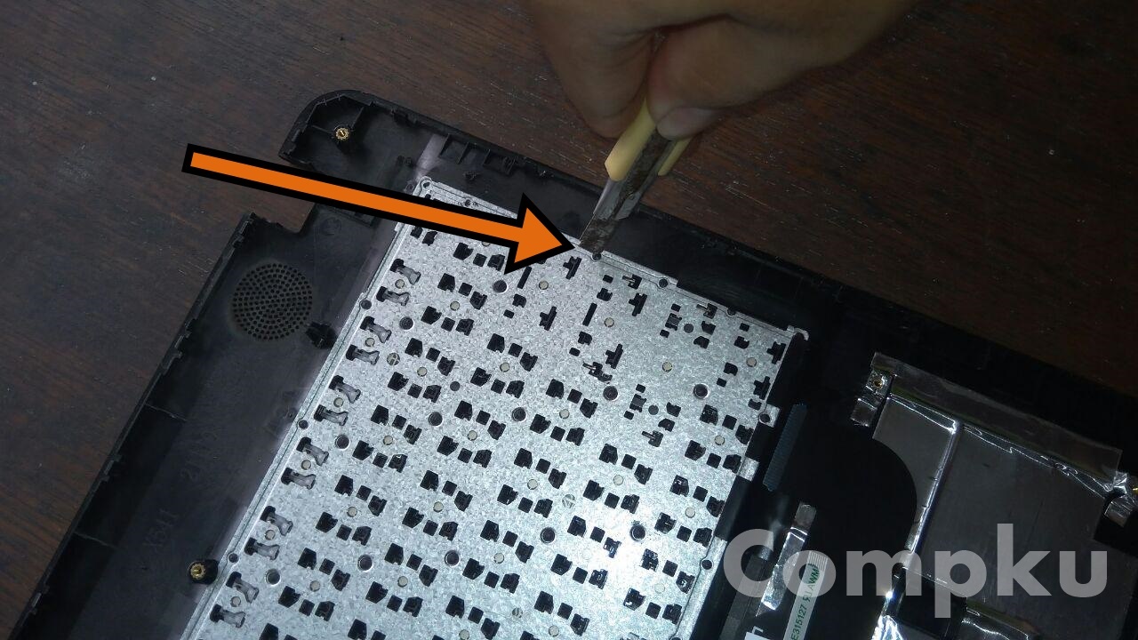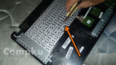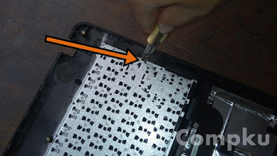 akhirnya sampai ke bagian yg sedikit menyulitkan yaitu mencongkel satu persatu pengunci keyboard plastik yg menempel pada casing, bisa menggunakan cutter.