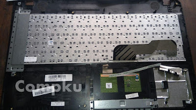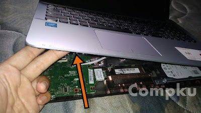 lalu buka perlahan casing atas, perlu diperhatikan ada kabel flexi keybaord dan touchpad.