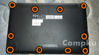 balikan Laptopnya, buka satu persatu baut yg tertempel pada belakang caing Laptop