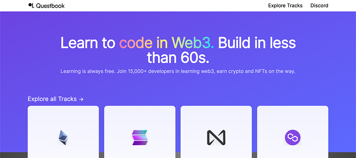 Learning is always free. Join 15,000+ developers in learning web3, earn crypto and NFTs on the way. It’s a very good platform to learn blockchain and web3 development. They have multiple Tracks to learn like Build on Ethereum, Build on Solana, etc. Even you can earn NFTs by completing Quests.
